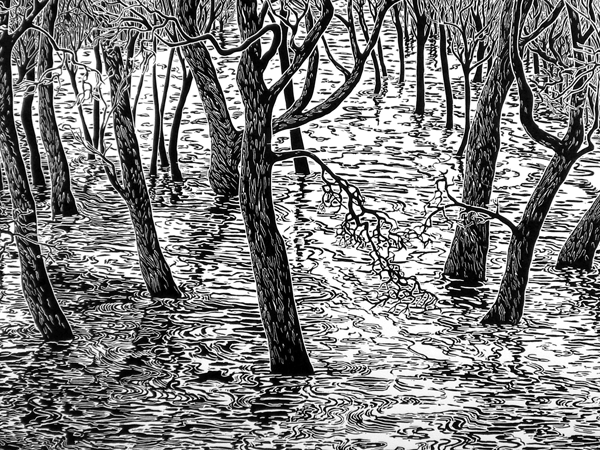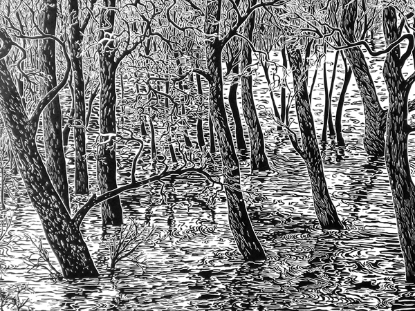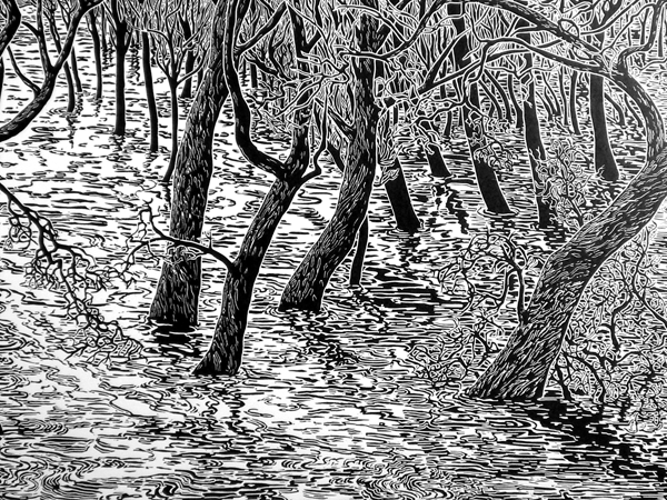 Details lino: Buiten zijn oevers 2002 90 x 180 cm