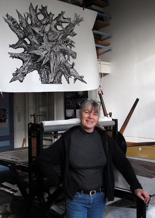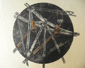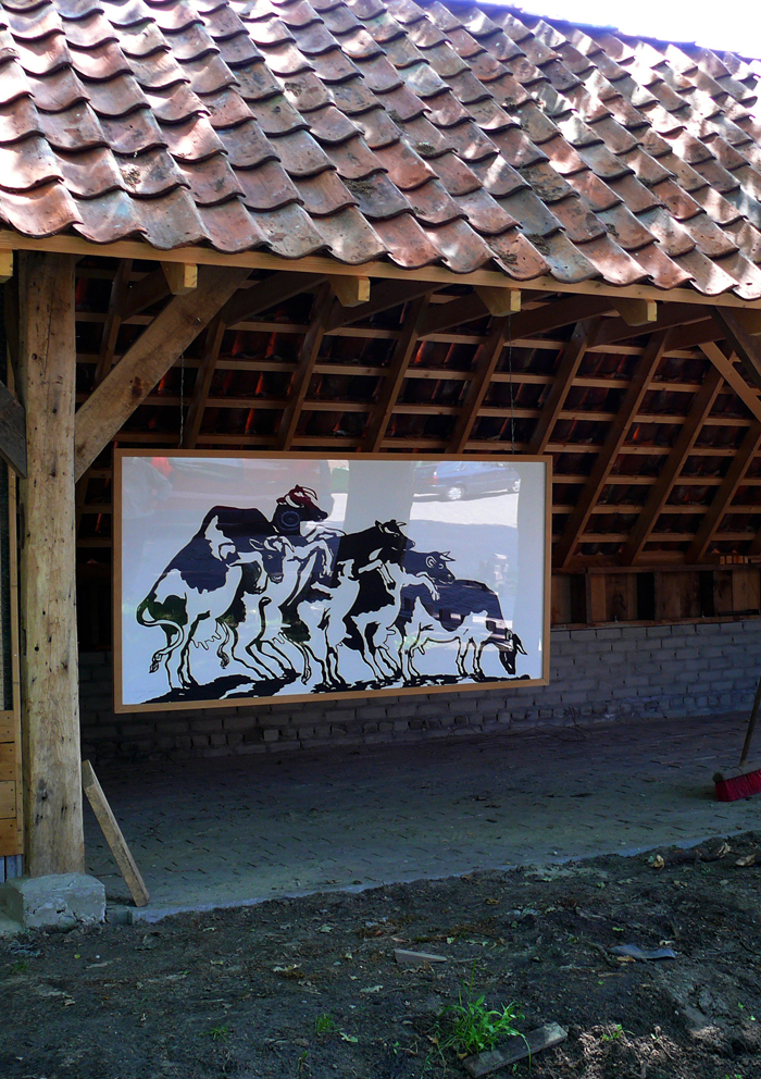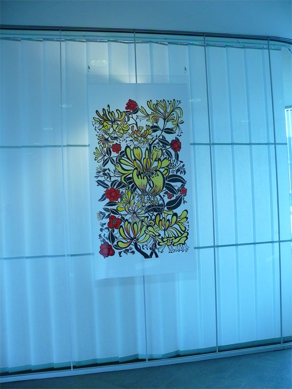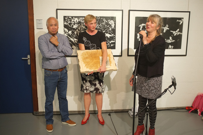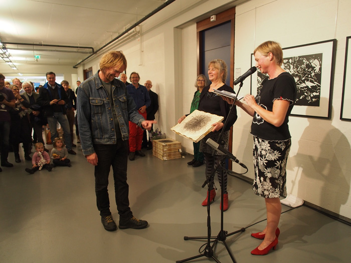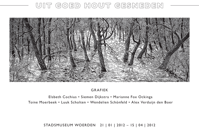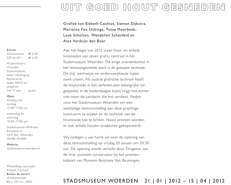 Op de foto de houder met een houtsnede van Wendelien Schönfeld.