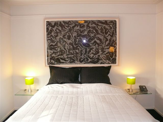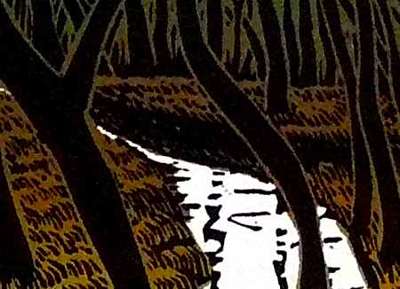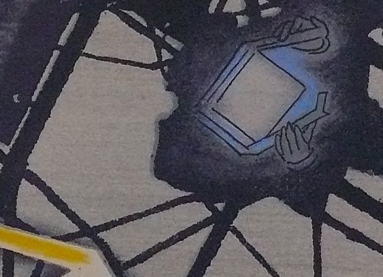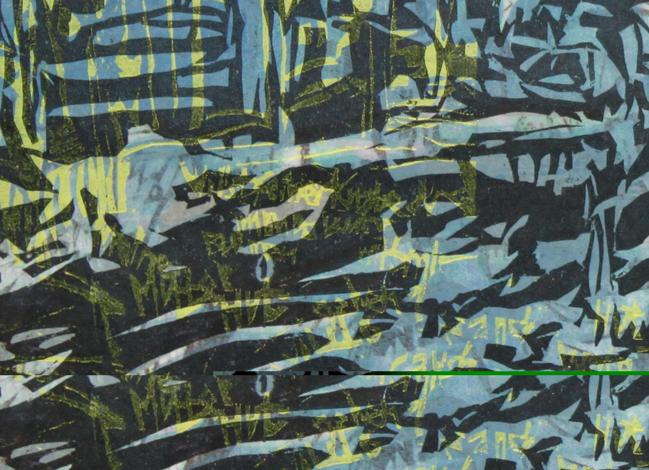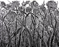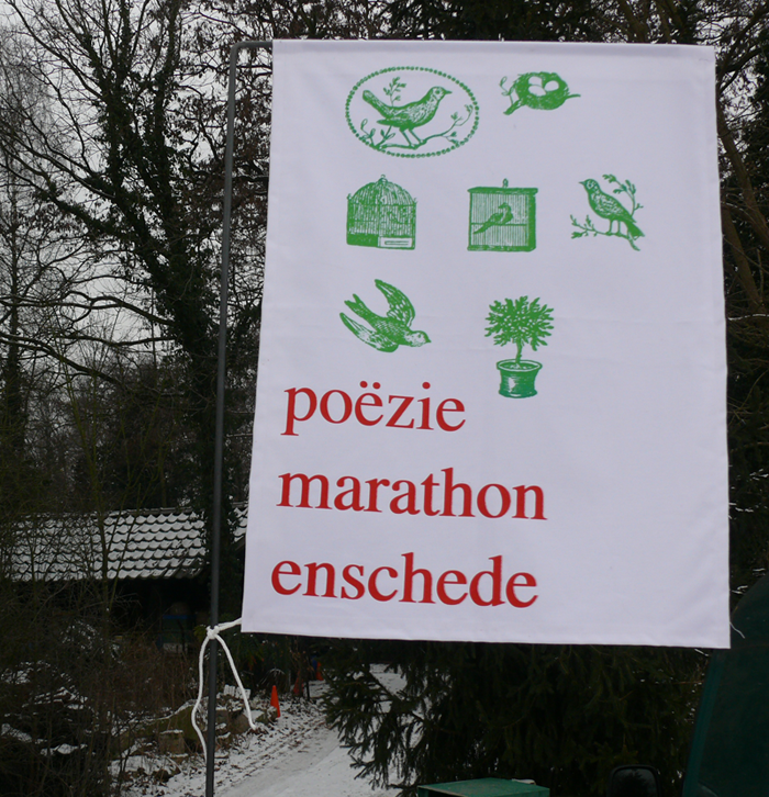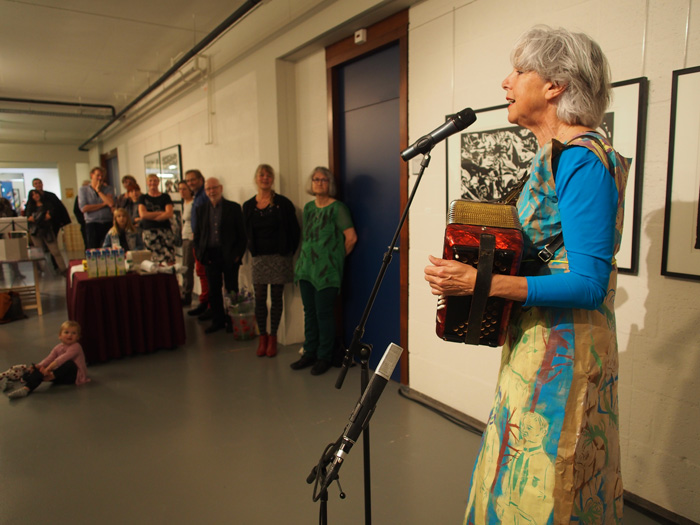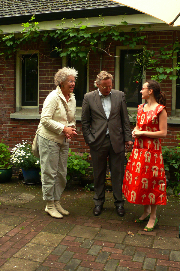 Op de foto de houder met een houtsnede van Wendelien Schönfeld.